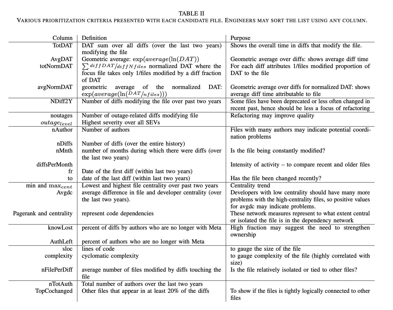 Prioritization Criteria: The researchers conducted interviews with Meta engineers and reviewed internal documents to identify over 20 criteria used to prioritize code improvements. These included frequency of change, outage association, complexity, and centrality within the call graph.