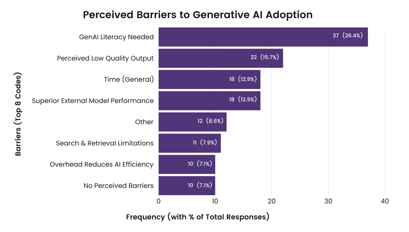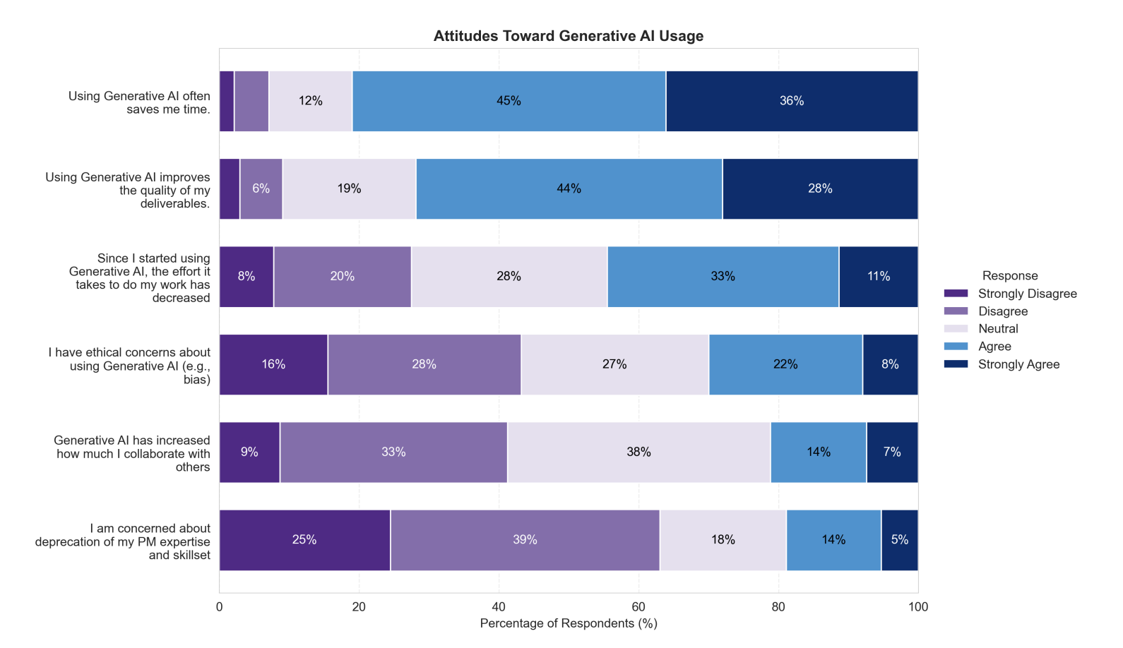 High adoption with quality concerns: 62% of PMs reported using GenAI daily or almost daily, but 47% cited concerns about output quality or inaccuracies as a barrier. While 81% agreed that “Using GenAI often saves me time,” the effort required to do their work hasn’t decreased for 56% of respondents, suggesting significant overhead in validating and refining AI outputs.