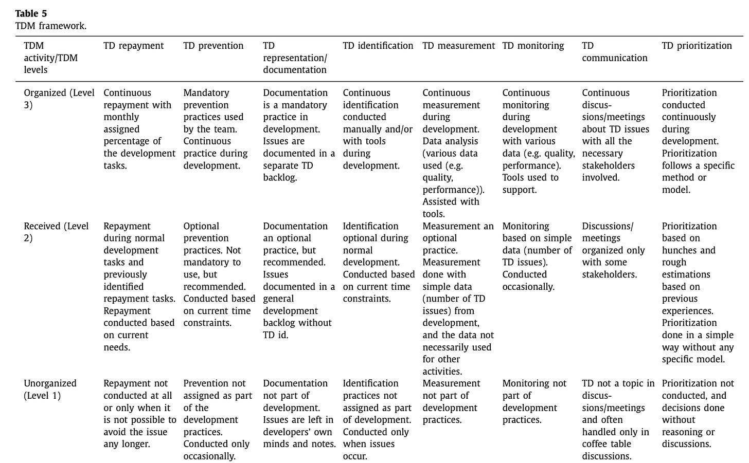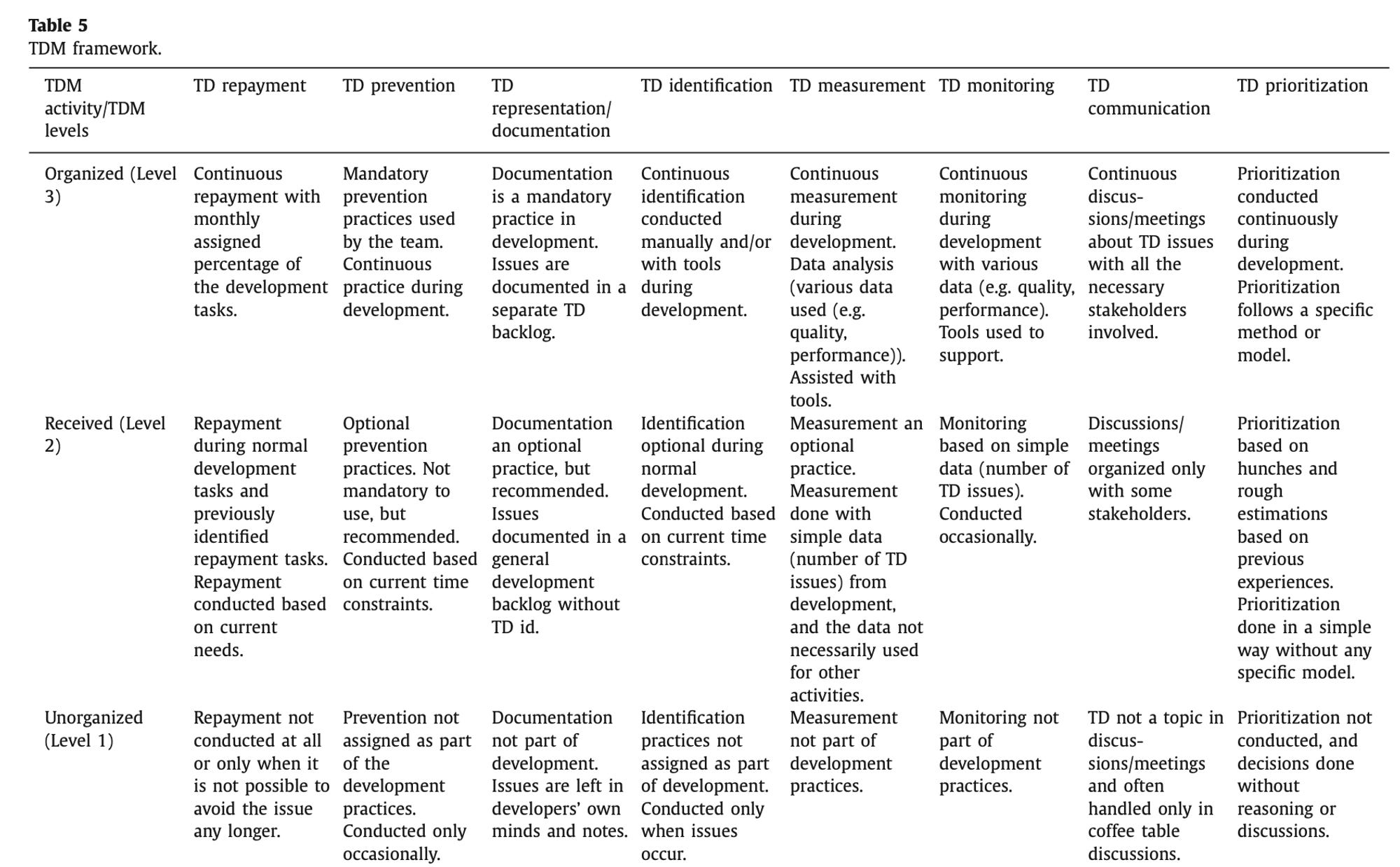 After studying each of the eight teams, researchers noted that every team had their own process of managing technical debt. Using their experiences, they put together a framework to understand the various styles of technical debt management across different activities.