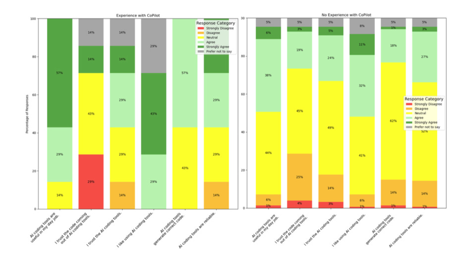 86% of users with prior experience agree that AI coding tools are useful, compared to only 44% of those without experience. 72% of those who had experience using Github Copilot reported they like using it, compared to only 43% of those who do not have experience.